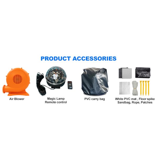 Air blower, disco light, remote control unit, repair kits, ropes, sandbags, nails, carry bag.